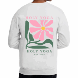You’ll love our comfy sweatshirt with a little hot pink flower on the front and giant Holy Yoga logo and flower on the back to represent!!